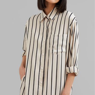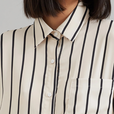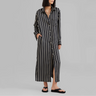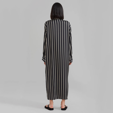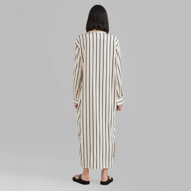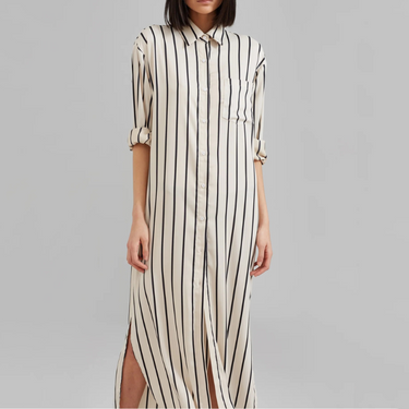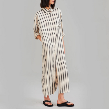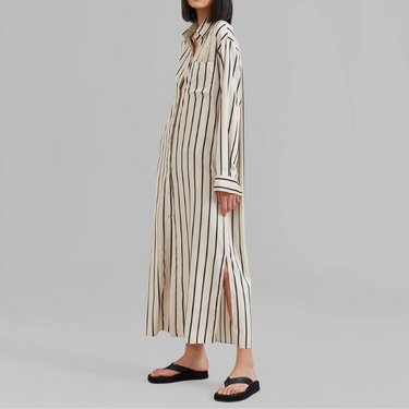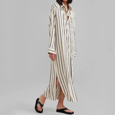 Indulge in opulent sophistication with our Full-Length Shirt Dress. This exquisite piece features a stylish slide slit, front button closure, and a captivating vertical stripes design.