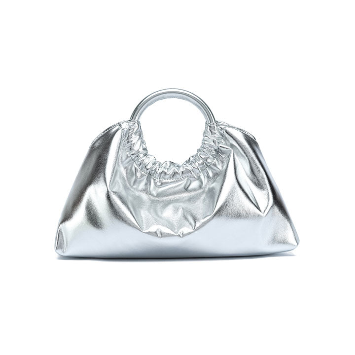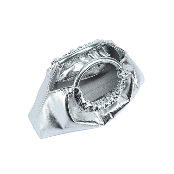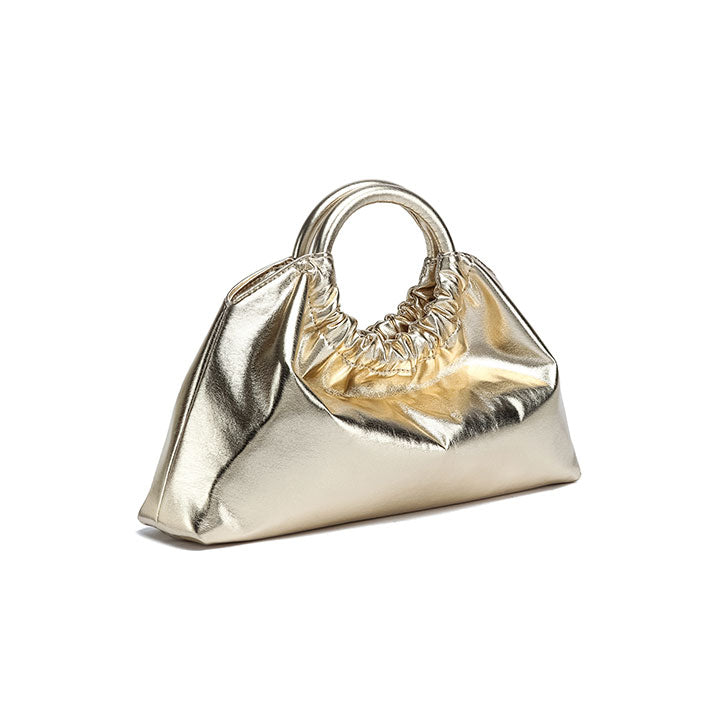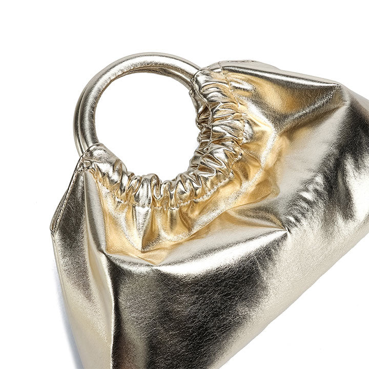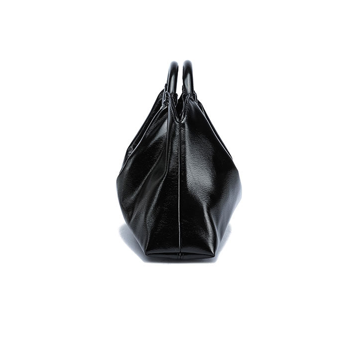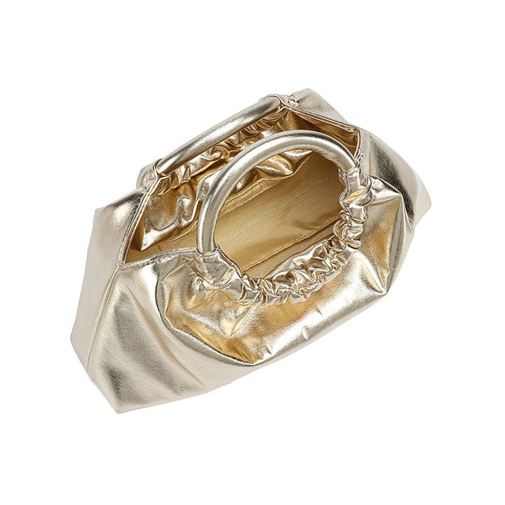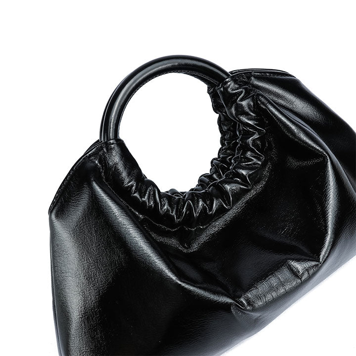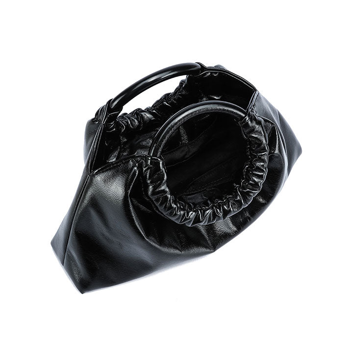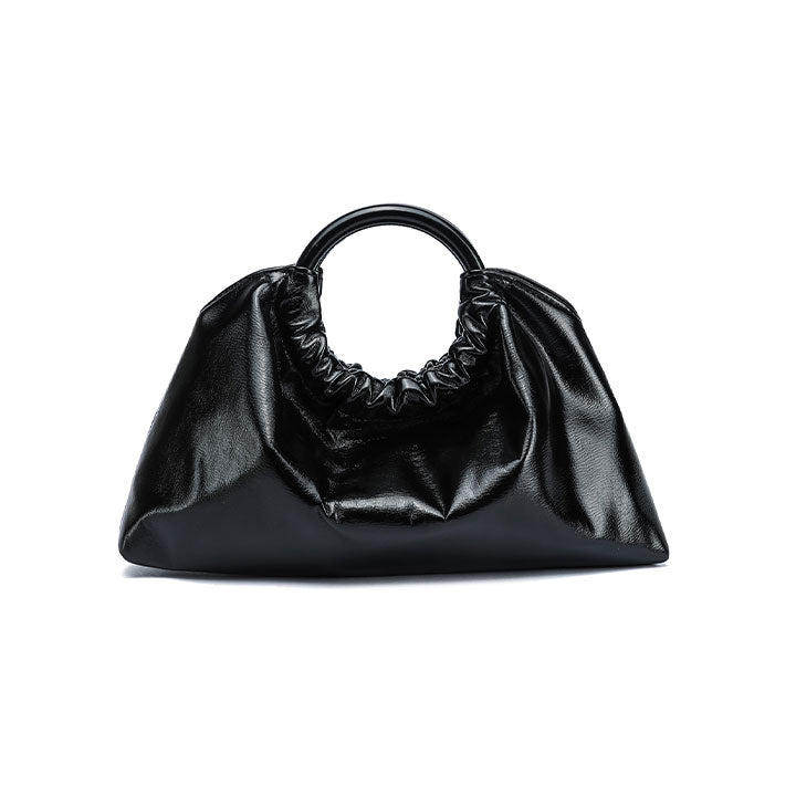 chic evening handbag with a soft gathered silhouette and a smooth, glossy finish for a touch of sophistication. Designed with a rounded top handle that adds structure and elegance, it blends modern style with timeless charm. Perfect for parties, dinners, or special occasions.