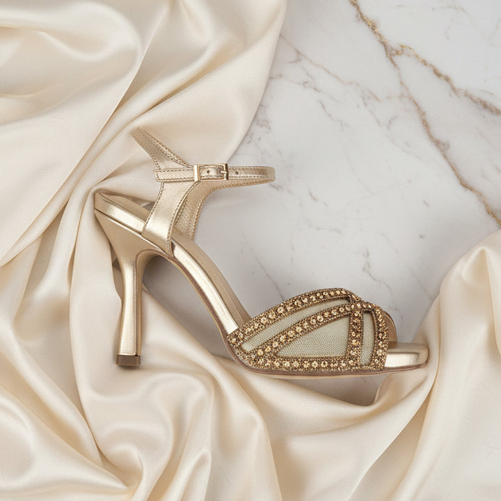 An elegant women’s open-toe ankle-strap sandal featuring a slim high heel and a glamorous crystal-embellished front. The design combines a sleek silhouette with sparkling details, making it ideal for evening wear, parties, weddings, and formal occasions.