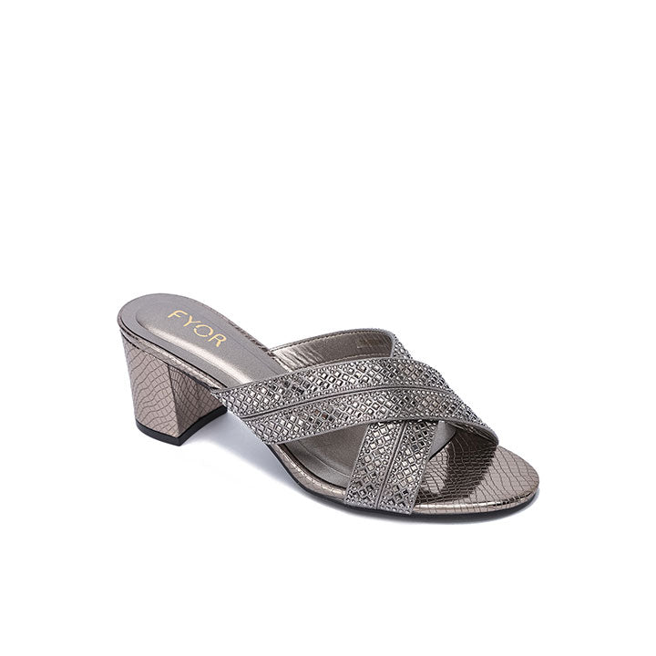 USP: Chic box heel elevation, distinctive diagonal lattice cutout, secure X-strap construction, comfortable stability, and effortless slide-on style for commanding, textured glamour.
