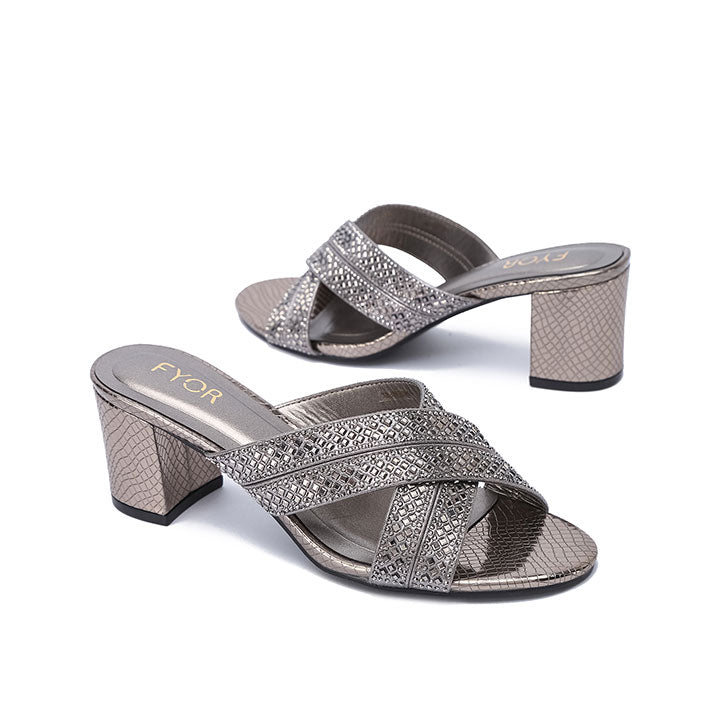 A bold box-heeled slide featuring a wide vamp created by crisscrossing straps with a striking diagonal lattice pattern accented by tightly set, shimmering micro-rhinestones.