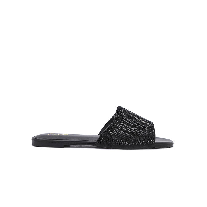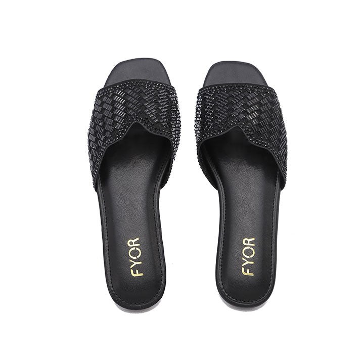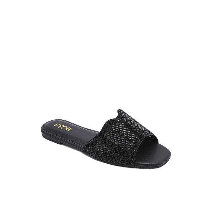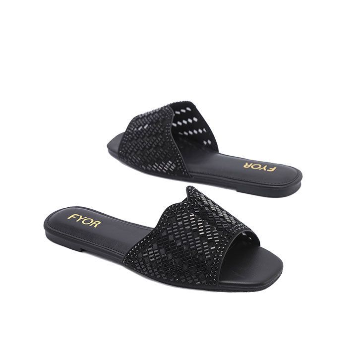 A dazzling flat slide sandal featuring a wide vamp strap with a distinctive scalloped top edge, adorned with a geometric lattice of mixed-size rhinestones for maximum sparkle and texture.