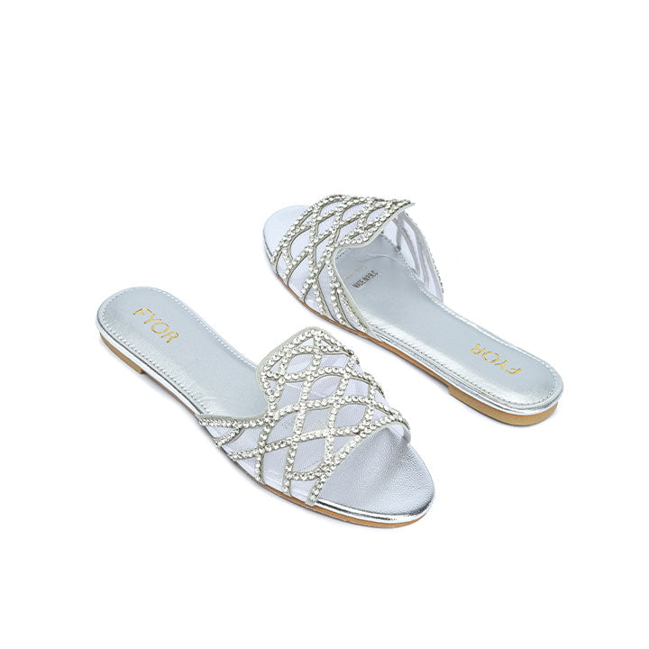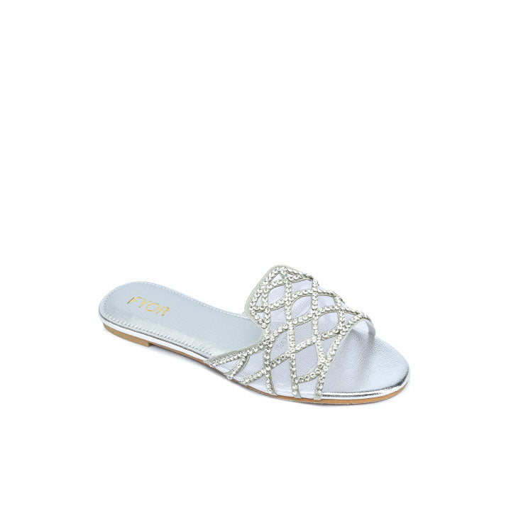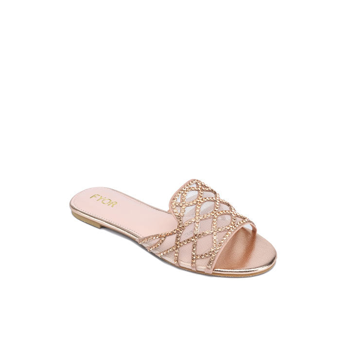 USP: Intricate diamond lattice design, sheer mesh and rhinestone combination, comfortable flat profile, high-shine footbed, and effortless slip-on style for refined, textural glamour.