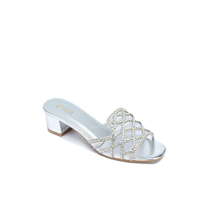 USP: Dramatic geometric lattice, sheer and embellished contrast, comfortable block heel elevation, secure wide strap, and sophisticated sparkle for standout evening style.