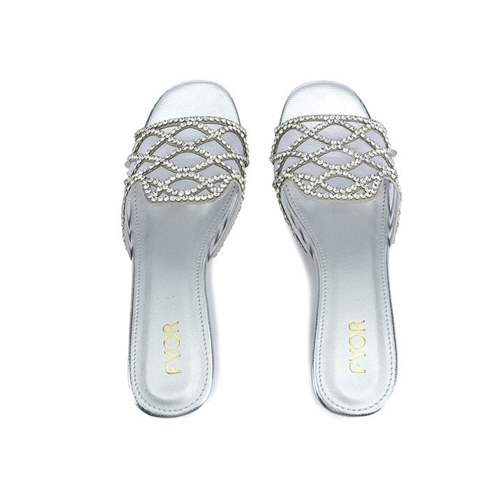 An eye-catching, elevated slide featuring a dramatic wide vamp constructed with sheer fabric and overlaid with a bold, geometric lattice of shimmering, faceted gemstones for high-impact texture.