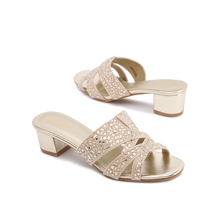 USP: Chic box heel, striking winged rhinestone design, comfortable stability, high-shine finish, and easy slide-on elegance.