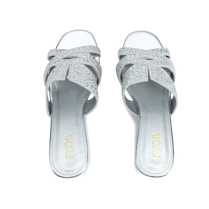 A glamorous box-heeled slide featuring a wide vamp strap with a bold symmetrical winged design, entirely embellished with precisely arranged, reflective rectangular-cut rhinestones.