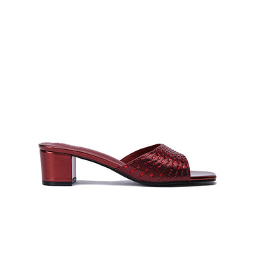 USP- Square-toe evening mule adorned with crystals, and slip-on design for easy and stylish wear.