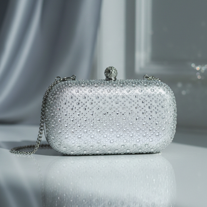An elegant evening clutch with a rounded hard-case body, fully adorned with sparkling crystals in a dotted pattern that creates a refined shimmer. It features a crystal-embellished clasp for a luxurious touch and a detachable chain strap for versatile styling. Perfect for parties, receptions, and special evening occasions.