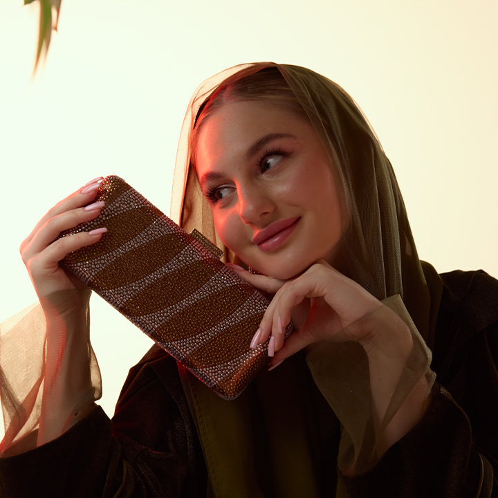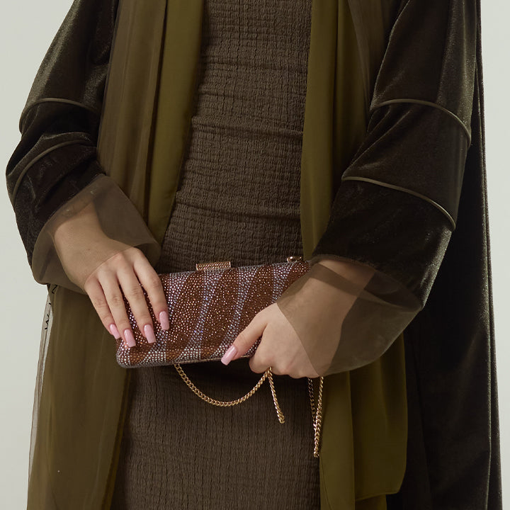 A dazzling rectangular clutch featuring a sleek hard-case design, beautifully adorned with shimmering crystals arranged in a wavy pattern that adds movement and sparkle. It features a sleek clasp closure and a detachable chain strap for versatile wear. Perfect for weddings, parties, and refined evening occasions.