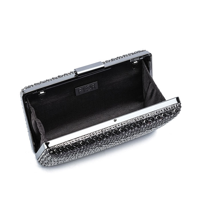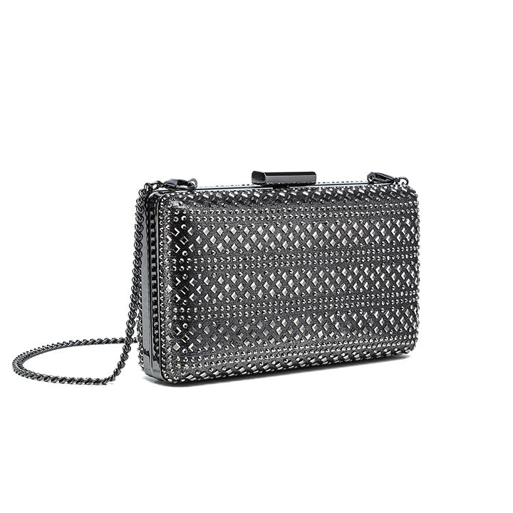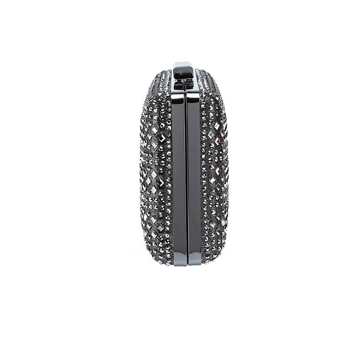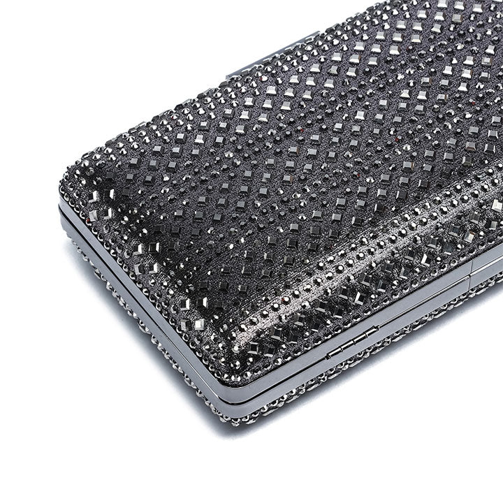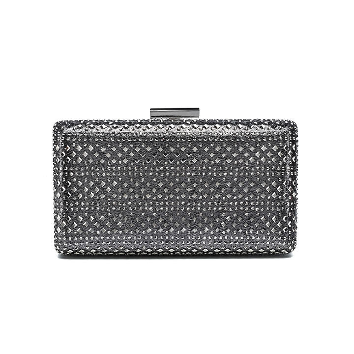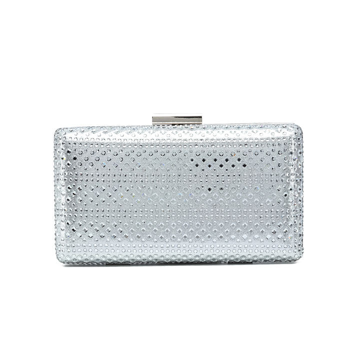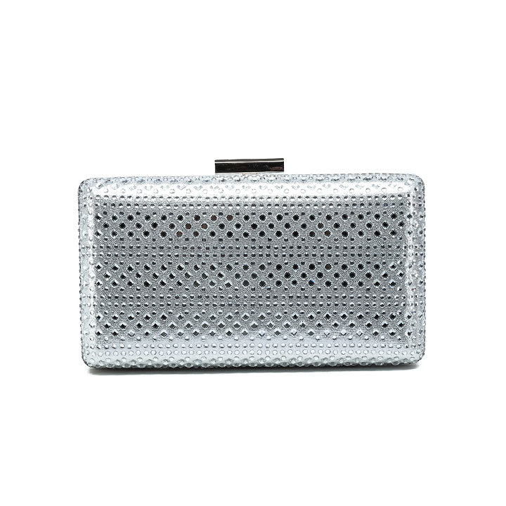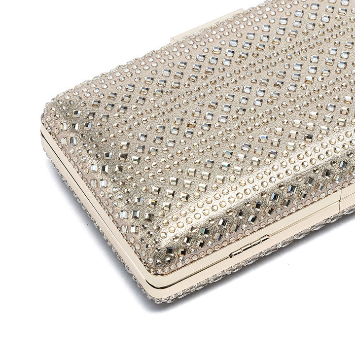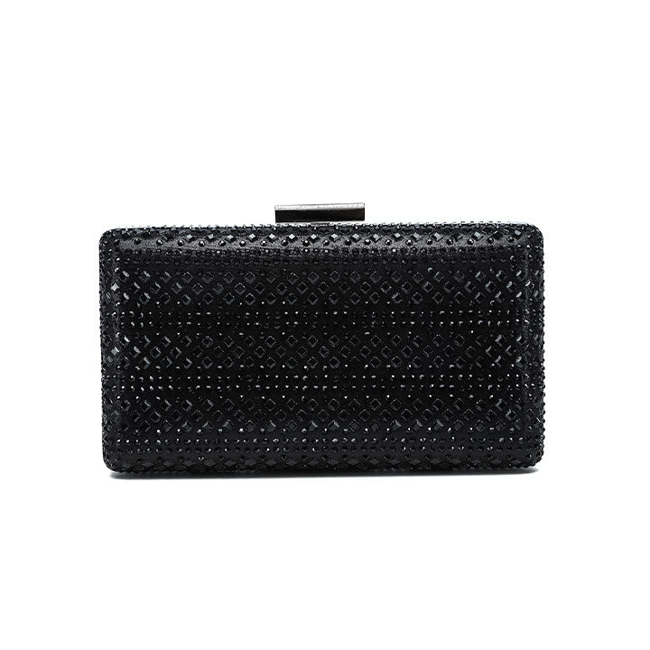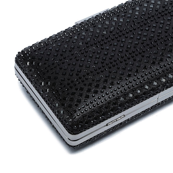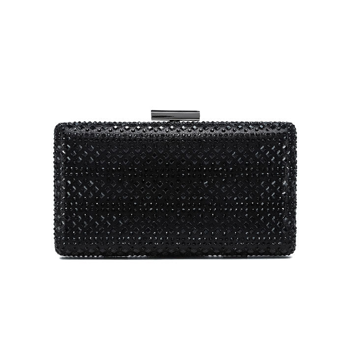 An elegant rectangular clutch with a structured hard-case body, fully adorned with fine crystals that create a uniform, radiant sparkle. The clutch features a clean, minimalist design enhanced by a sleek metallic frame and a top clasp closure. Perfect for weddings, and evening occasions, it adds a touch of timeless sophistication to any ensemble.