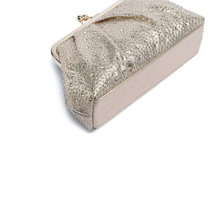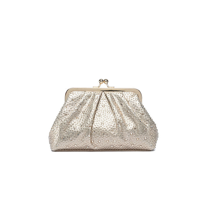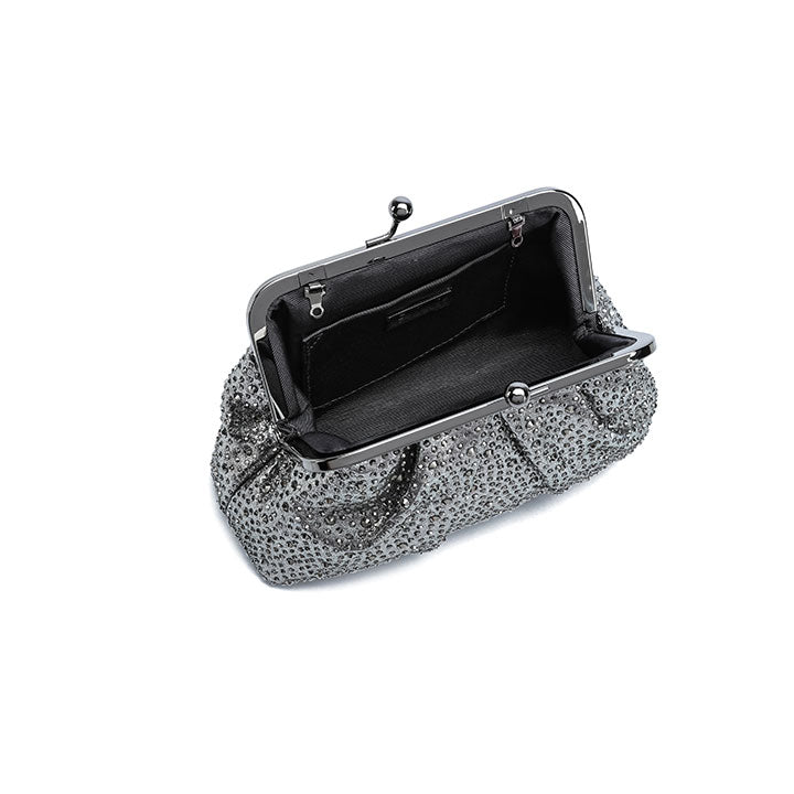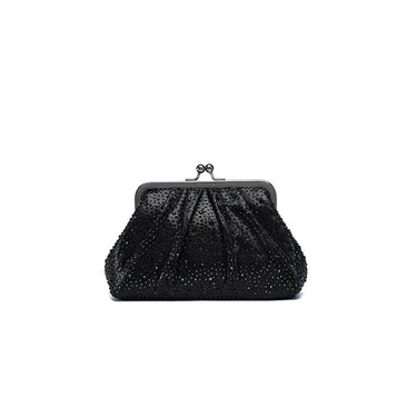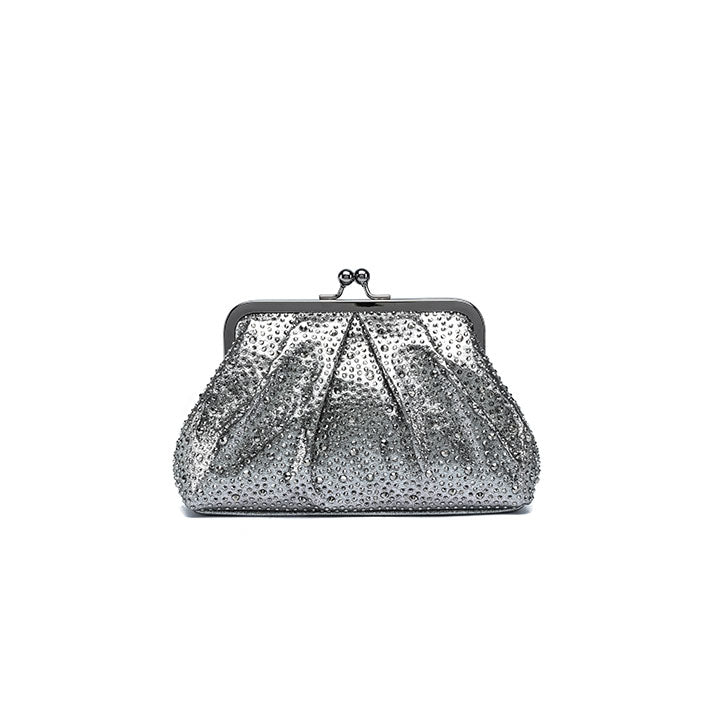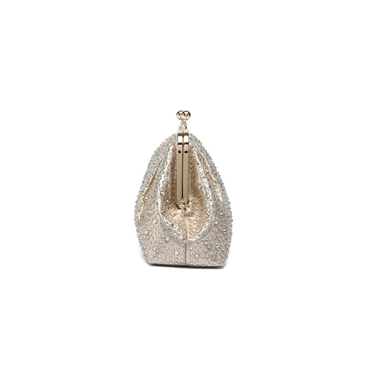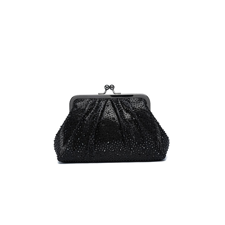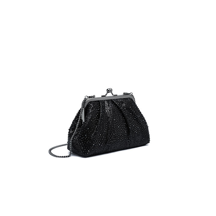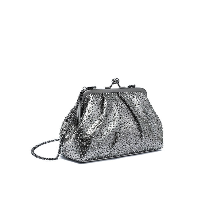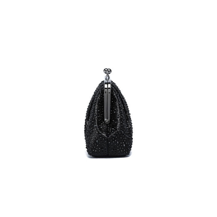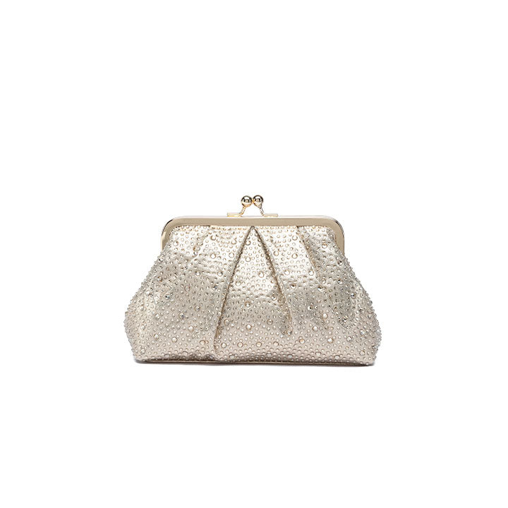 A graceful evening clutch featuring a softly pleated design that exudes timeless sophistication. The structured silhouette is fully encrusted with shimmering crystals, reflecting light beautifully from every angle. It is finished with a polished metallic frame and a classic kiss-lock closure, making it the ideal companion for formal events, weddings, and elegant evenings.