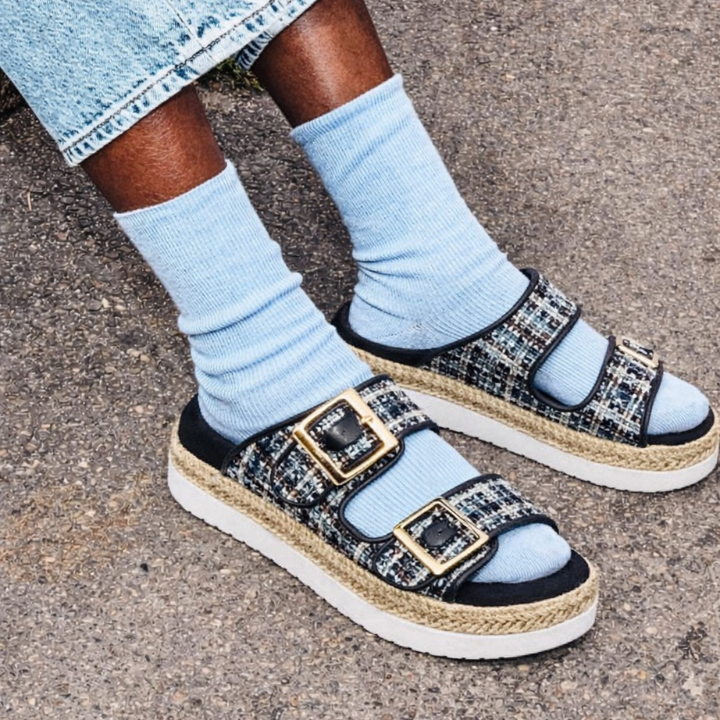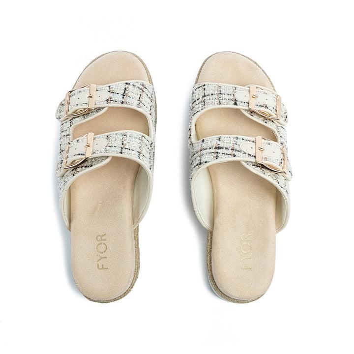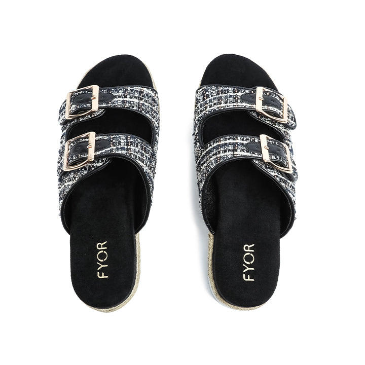 A chic flat sandal featuring a textural, woven tweed upper with two adjustable buckled straps for a custom fit. The style is built on a comfortable platform sole wrapped with metallic-toned rope detailing.