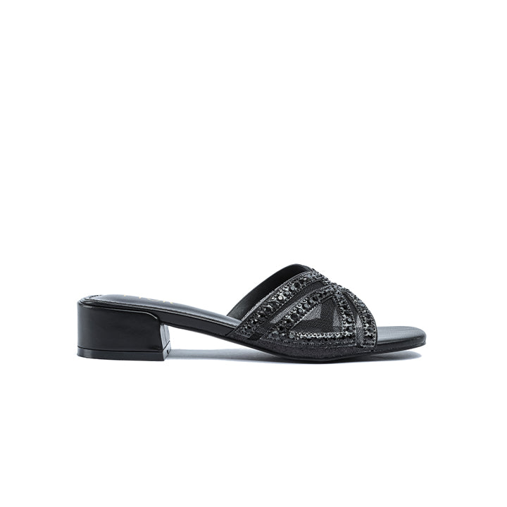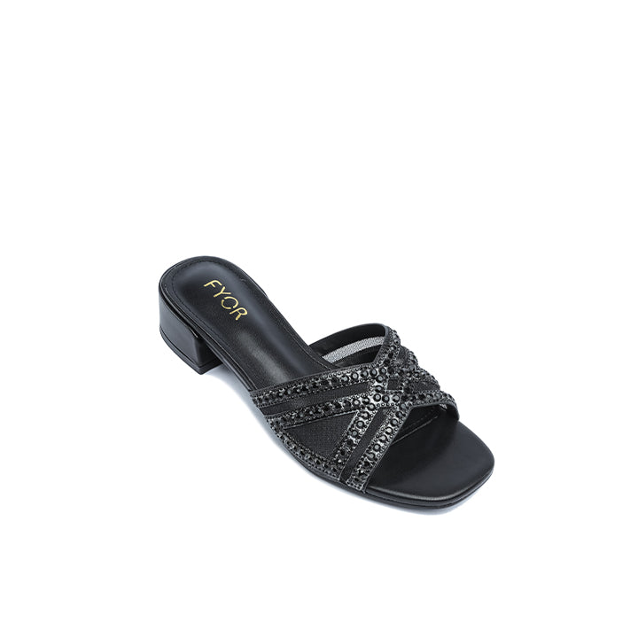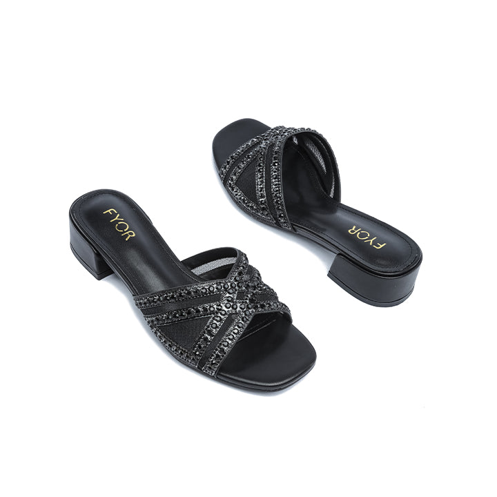 USP: Chic box heel elevation, sheer mesh and sparkle contrast, geometric rhinestone banding, comfortable stability, and polished slip-on style for elevated textural shine.