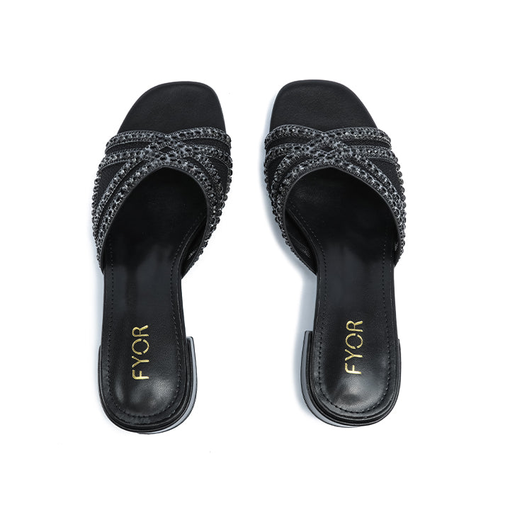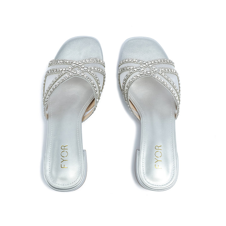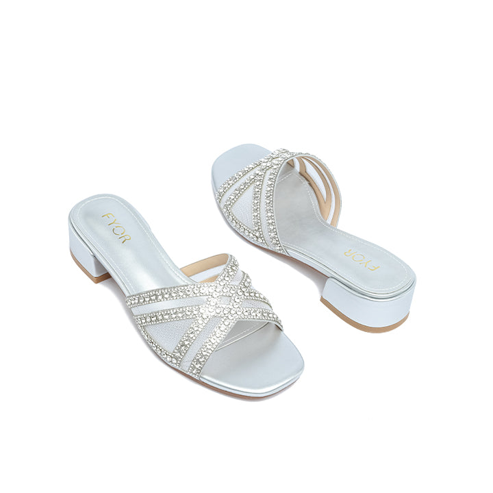 An elegant box-heeled slide featuring a wide vamp constructed with sheer mesh panels overlaid by diagonal bands of dense, sparkling micro-rhinestones for a refined, geometric design.