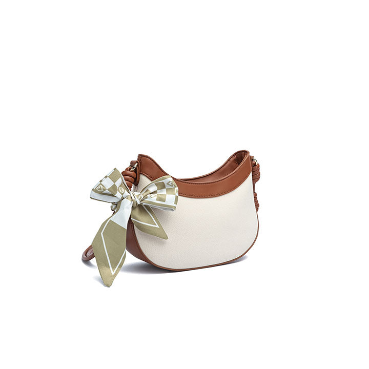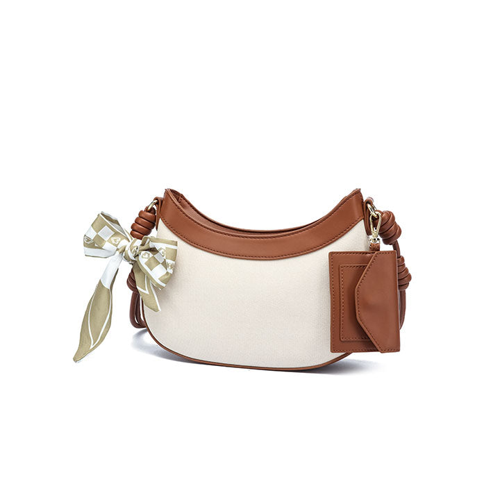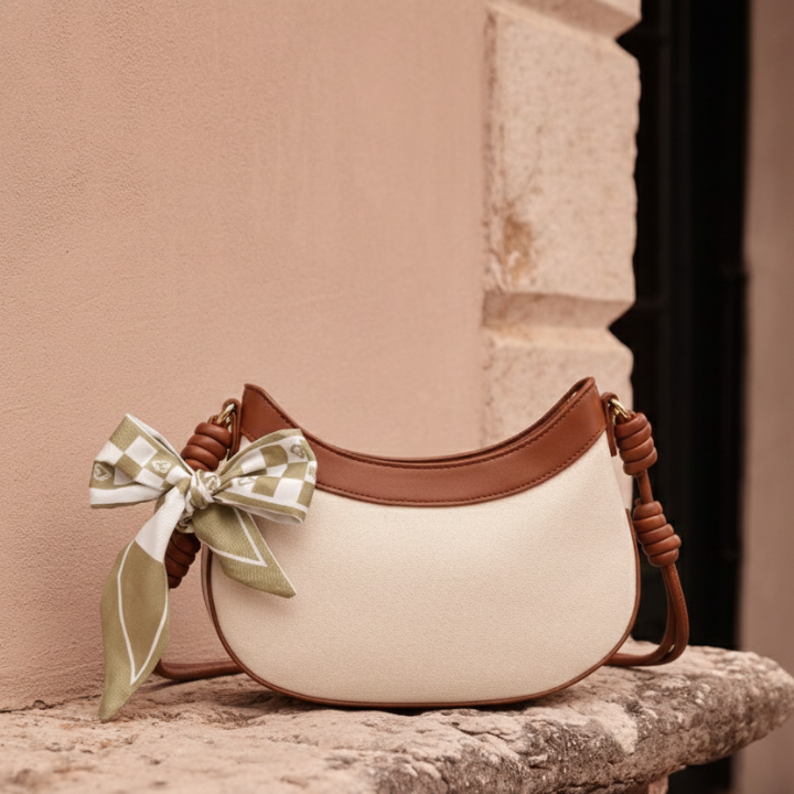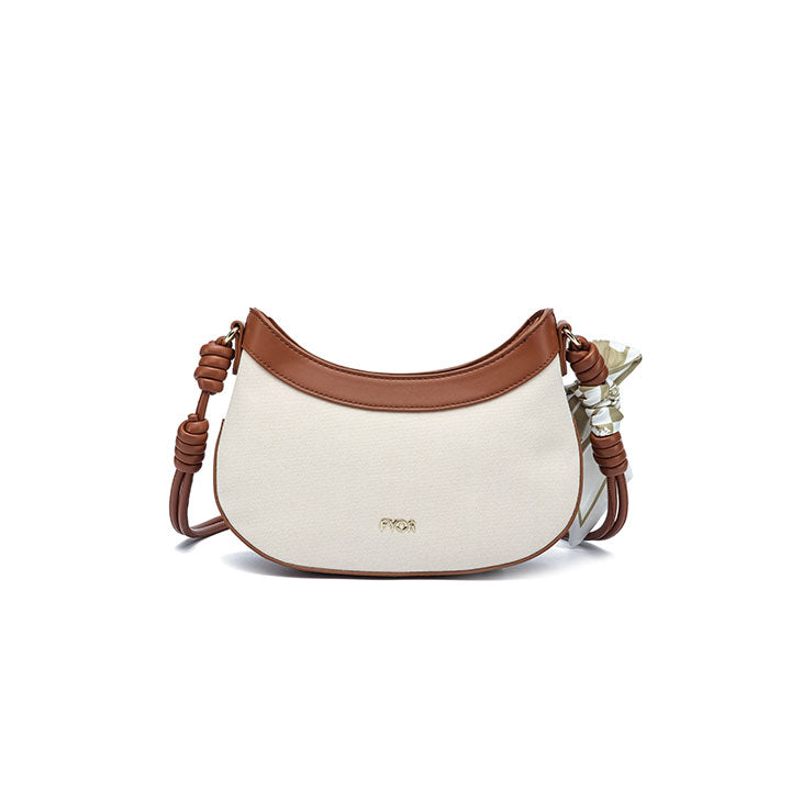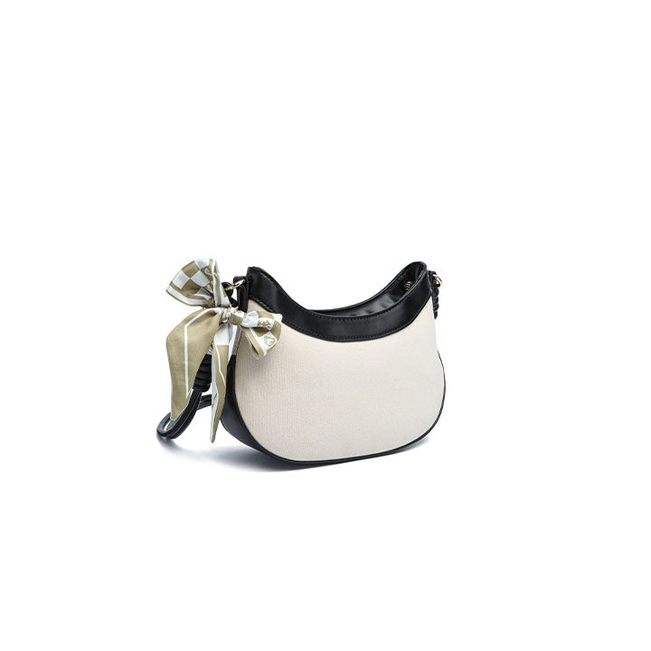 USP : Modern crescent shape, bold contrast trim, adjustable comfort strap, secure zipper entry, and a minimalist-chic aesthetic.