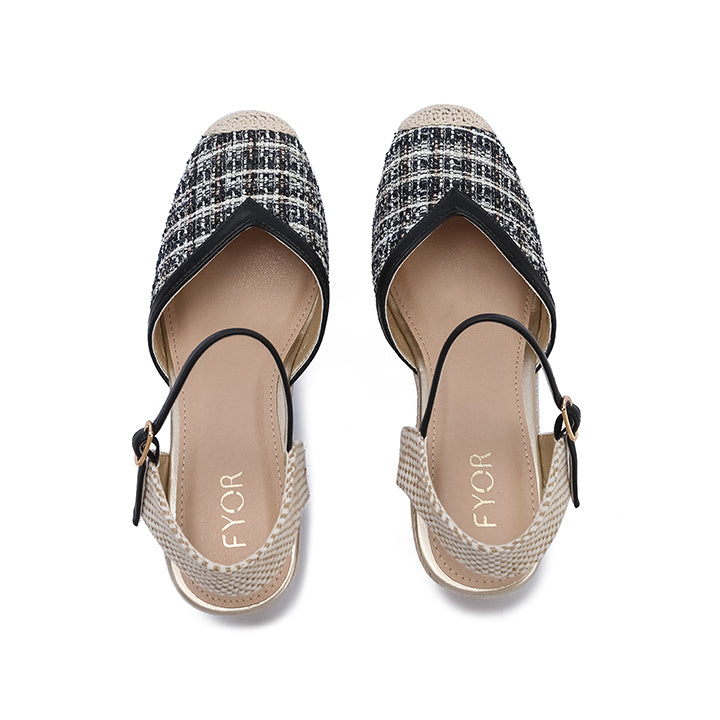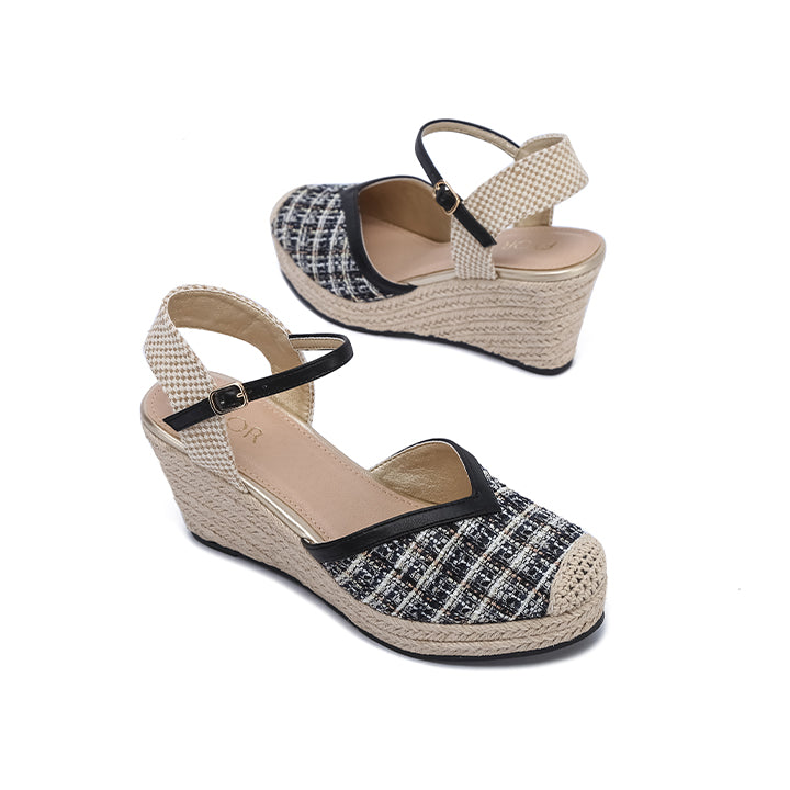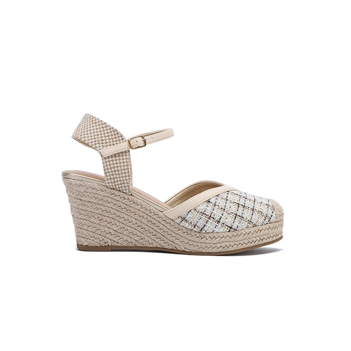 A stylish wedge sandal featuring a traditional woven jute sole and a closed toe with a plaid texture. The adjustable ankle strap provides a secure and comfortable fit for summer wear.