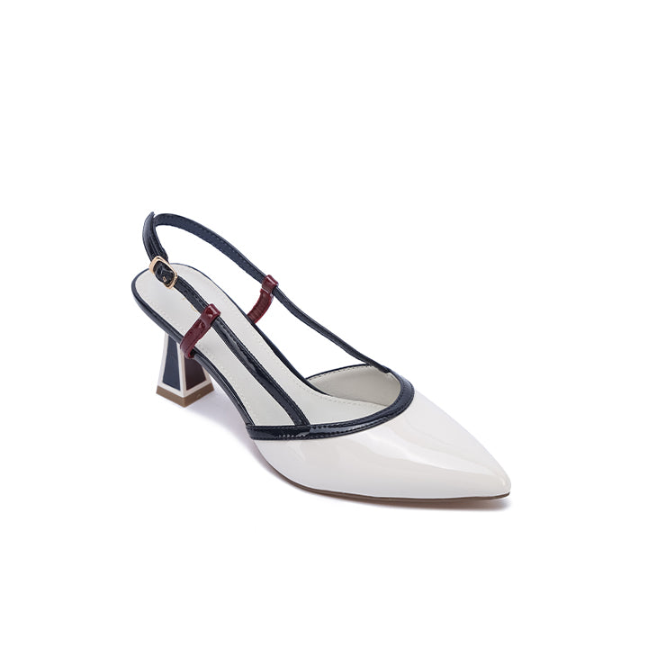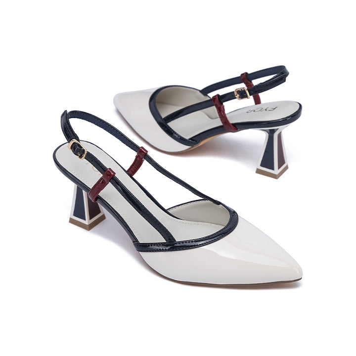 USP: Bold tricolor heel, sculpted design, contrasting straps, elegant pointed toe, and adjustable slingback.