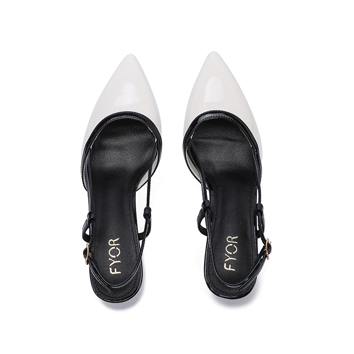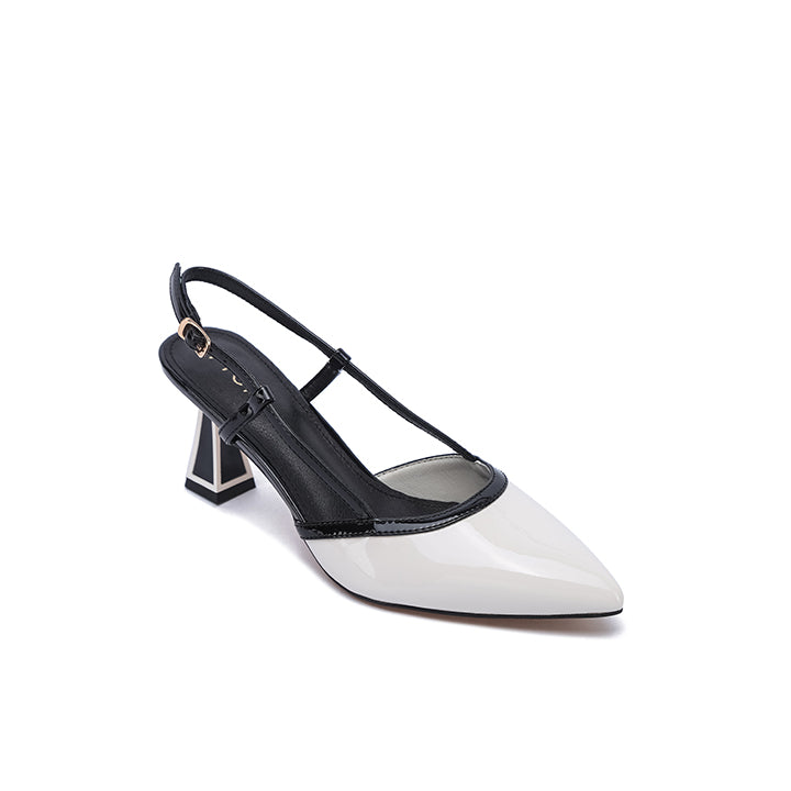 A striking slingback heel with an elegant pointed toe and a unique sculpted heel featuring a bold tricolor design. The contrasting straps and heel create a sophisticated and modern look.