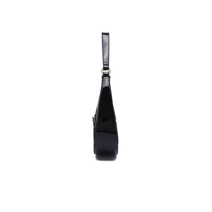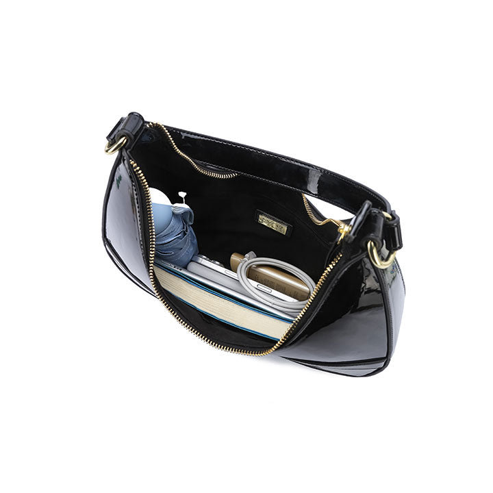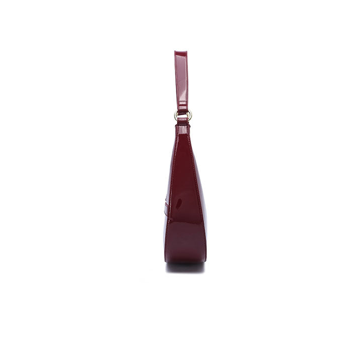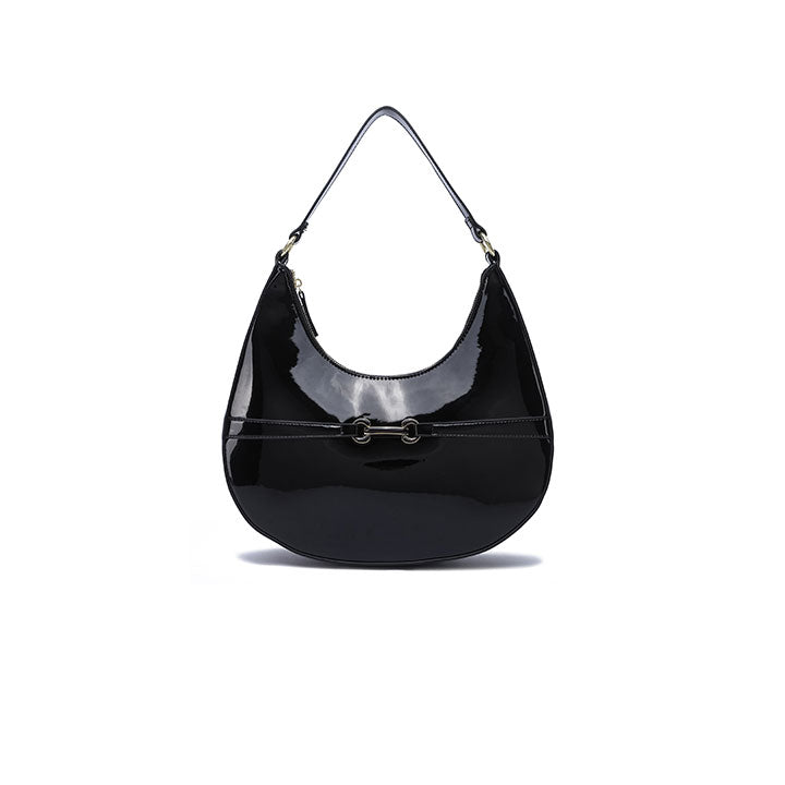 This contemporary shoulder bag boasts a unique curved design and a high-shine finish, complete with a comfortable top handle and a removable, adjustable strap for effortless styling.
