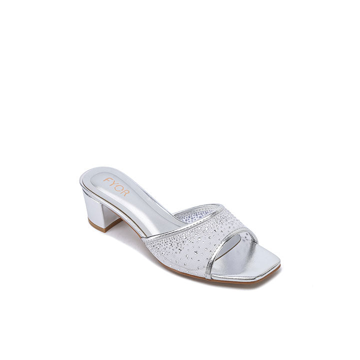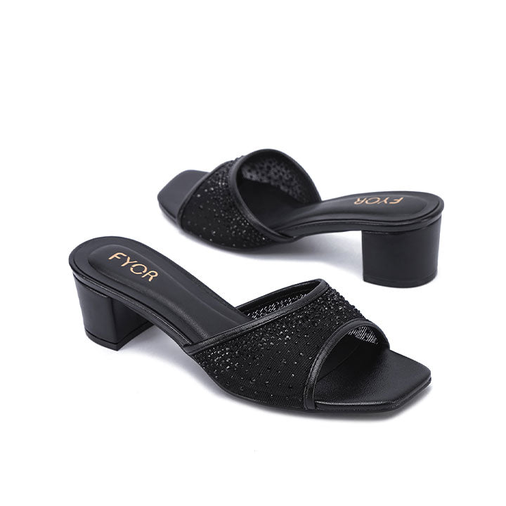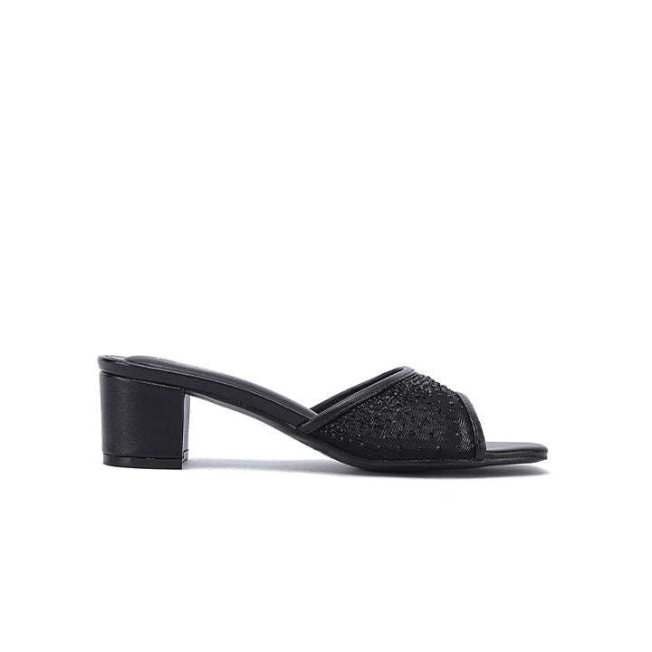 USP: Crystal-embellished square-Toe Design evening mule with a shimmering mesh strap and stable mid-block heel.