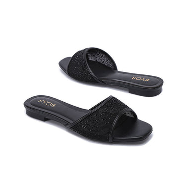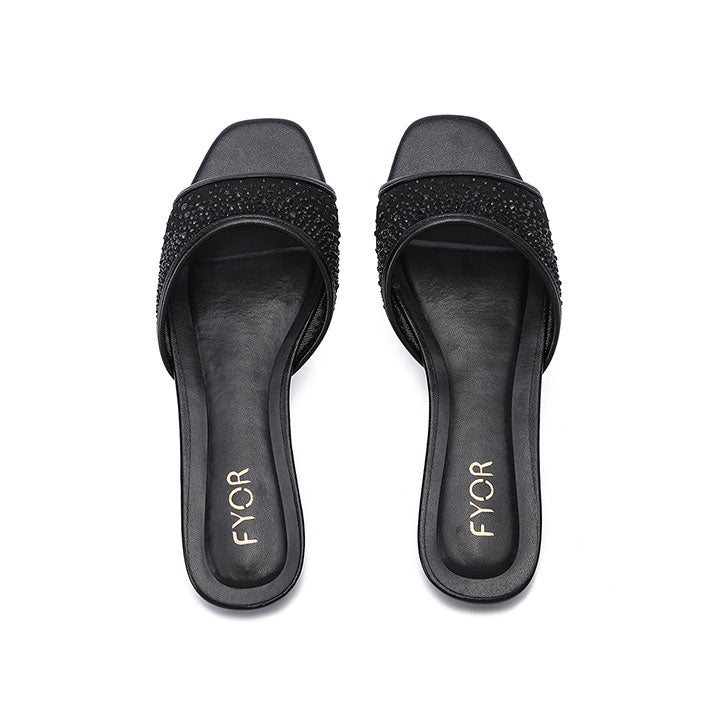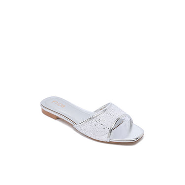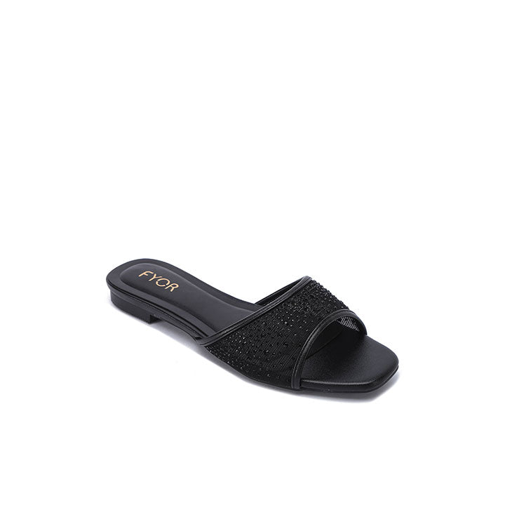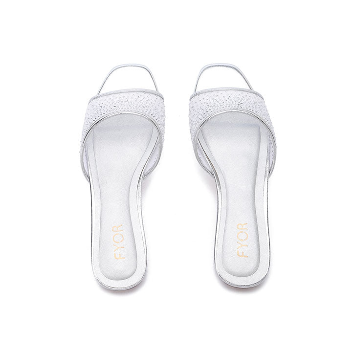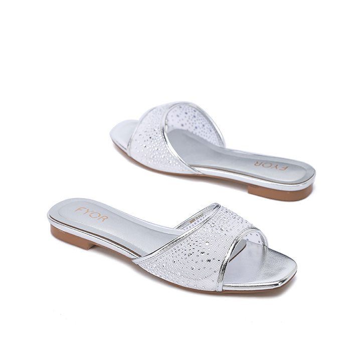 An elegant flat sandal designed with a modern open Toe Design and a shimmering mesh front strap encrusted with brilliant diamanté crystals. It is the perfect choice for bridal parties and elevated casual events.