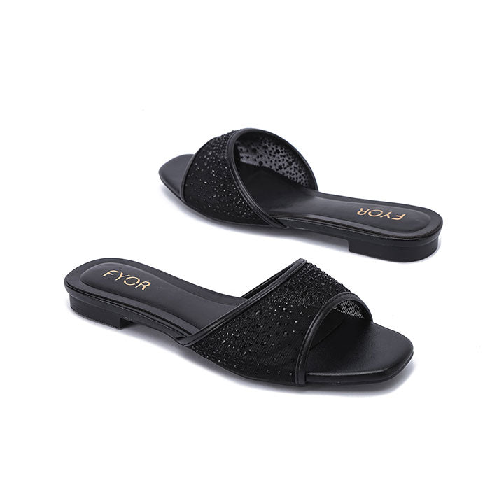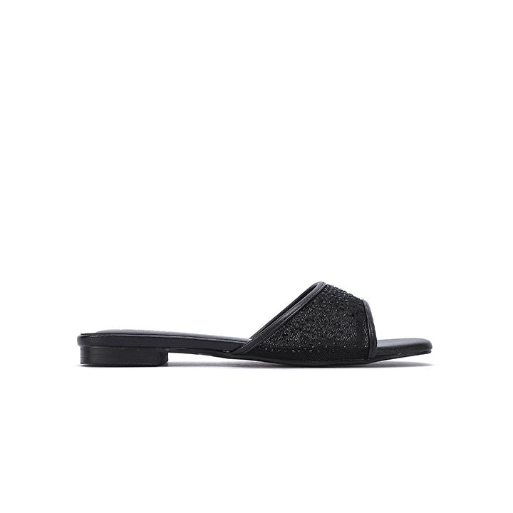 USP: Crystal-embellished open-Toe Design evening flat with a shimmering mesh strap and comfortable low-profile sole.