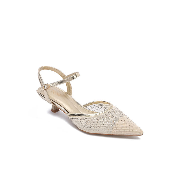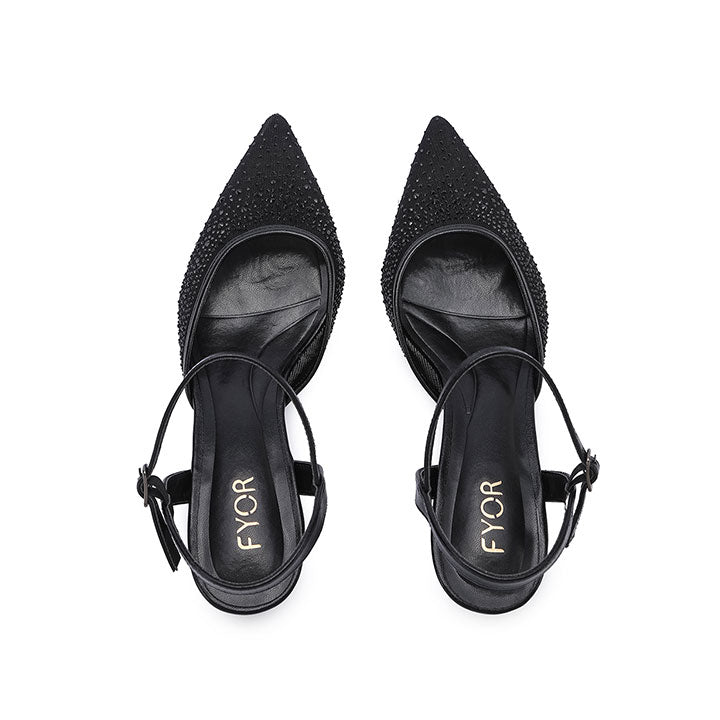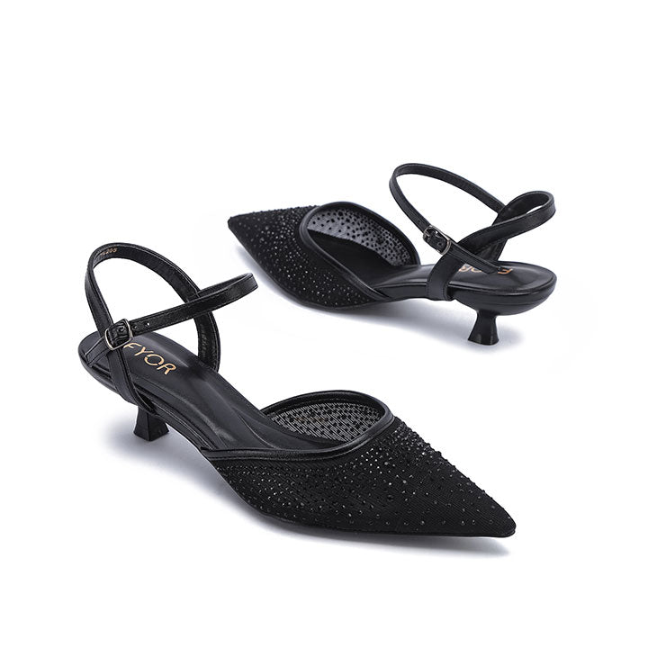 USP: Crystal-embellished pointed-Toe Design evening pump with a slim ankle strap and refined low kitten heel.