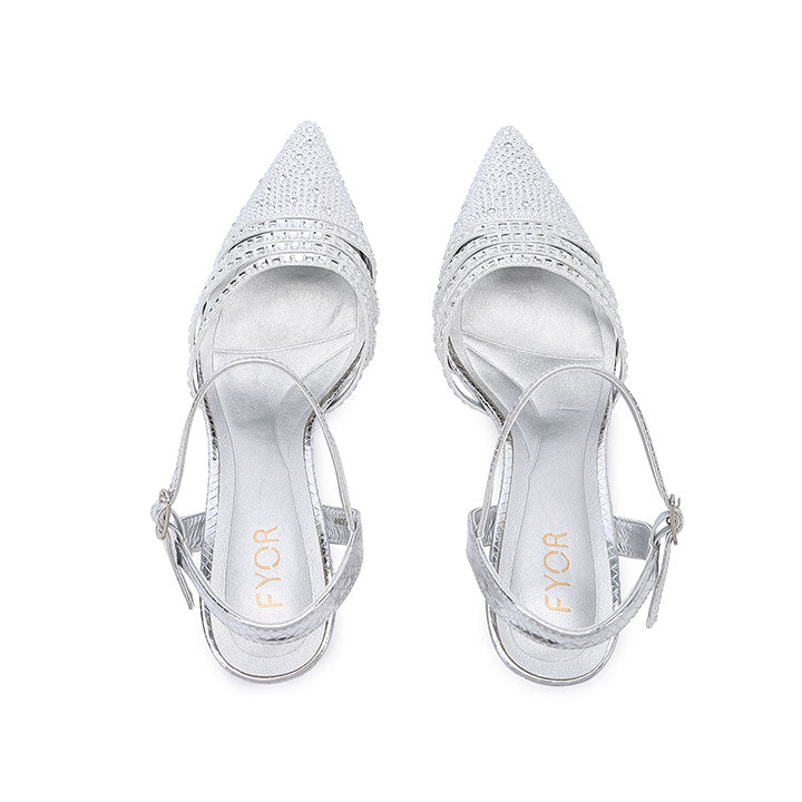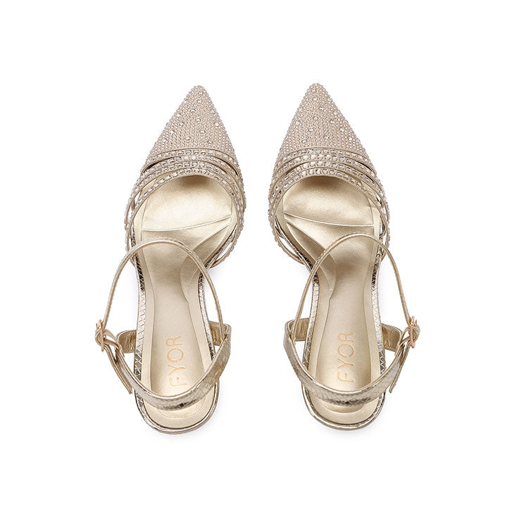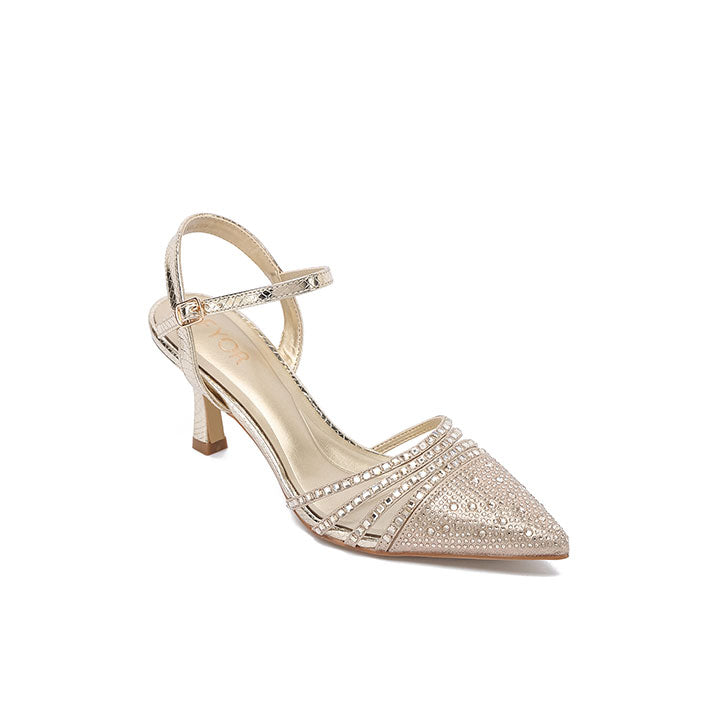 Step into the spotlight with these exquisite pointed-Toe Design slingback heels, featuring a dazzling array of micro-crystals and elegant multi-strap detailing. The textured metallic finish and sleek kitten heel provide a modern, sophisticated silhouette with a secure, adjustable ankle strap. These heels are the perfect choice for weddings.