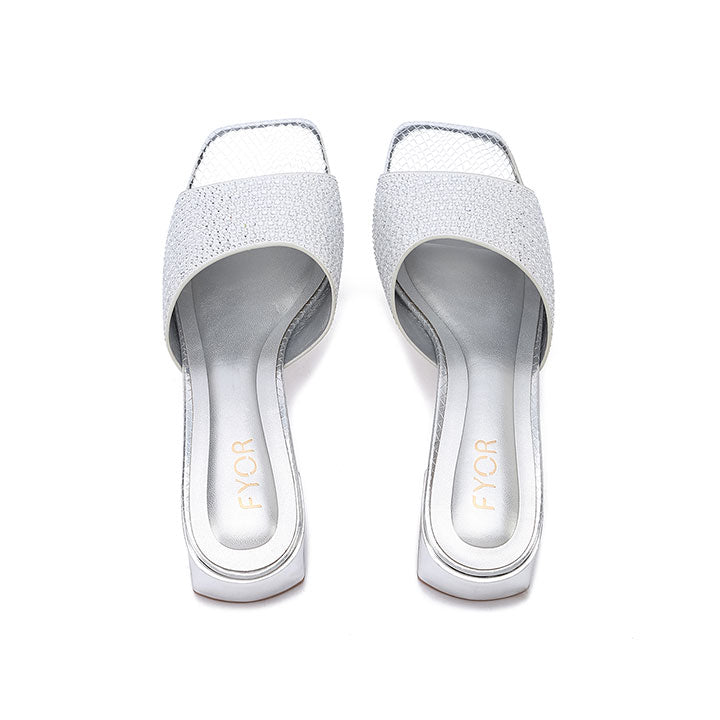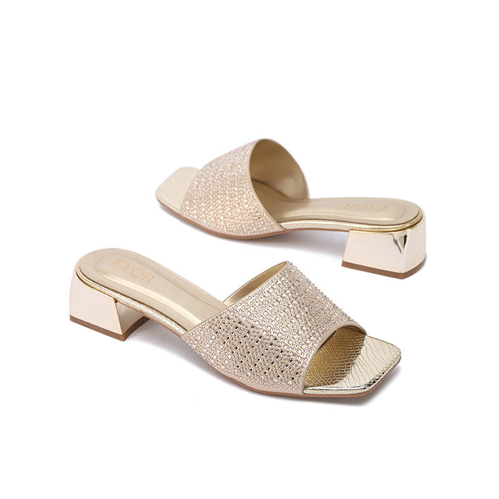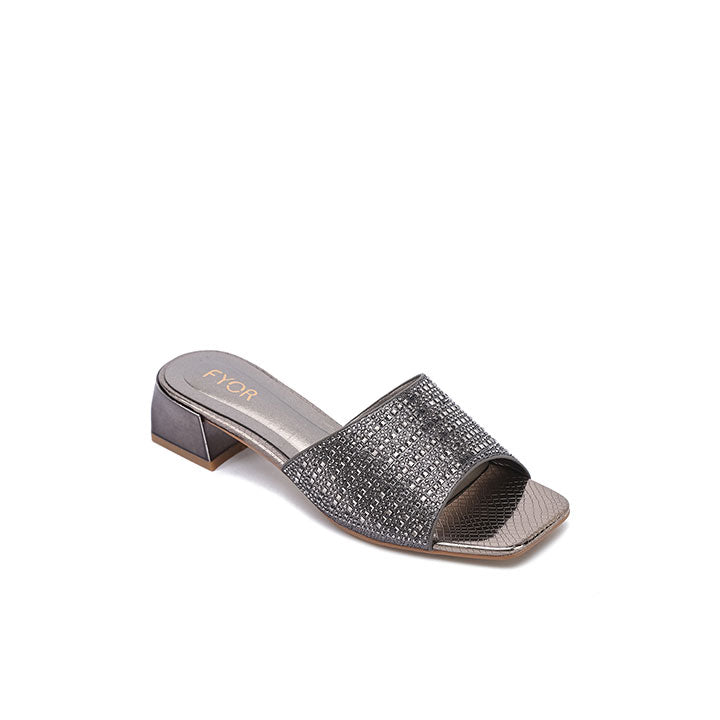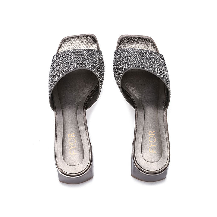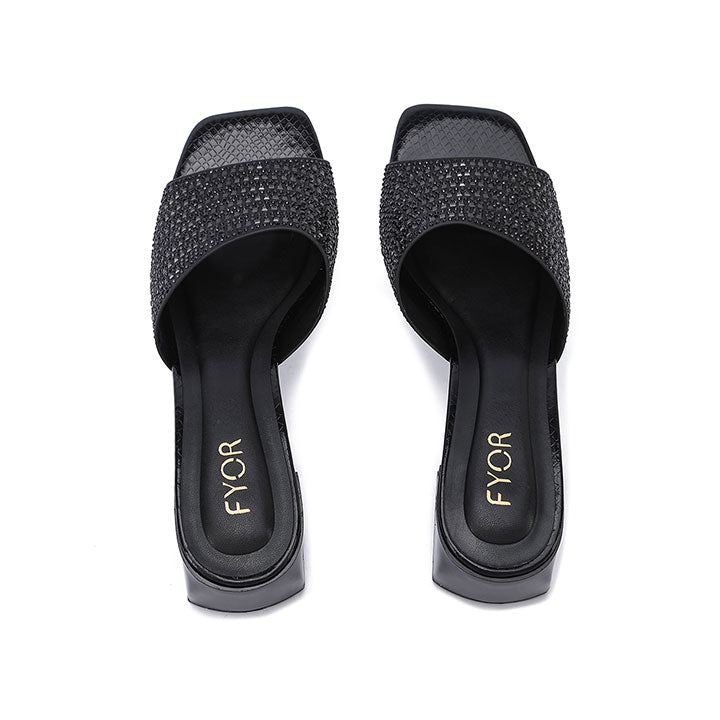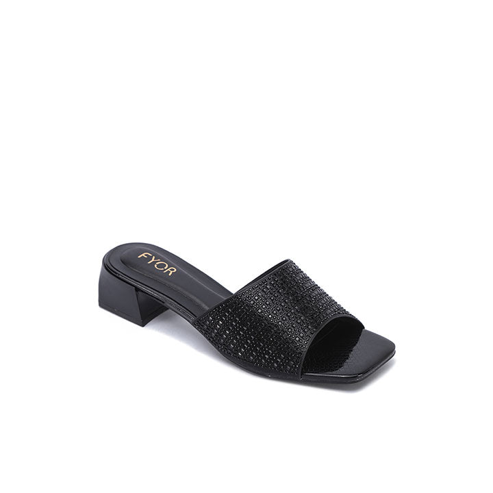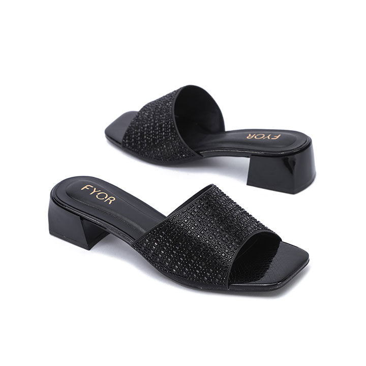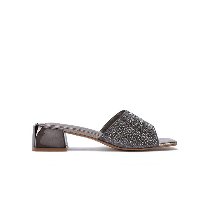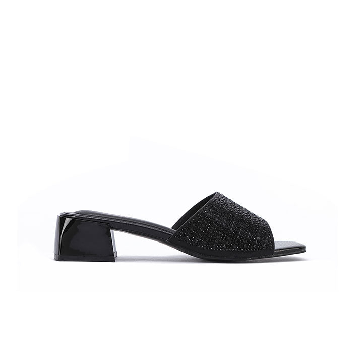 Make a bold statement with these mules, featuring a wide strap fully encrusted with tonal square crystals for a sleek look. The sturdy block heel and modern square Toe Design provide a contemporary edge, making them as comfortable as they are striking for evening events.