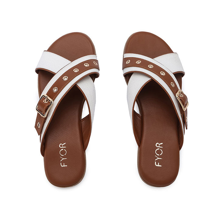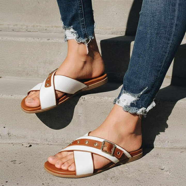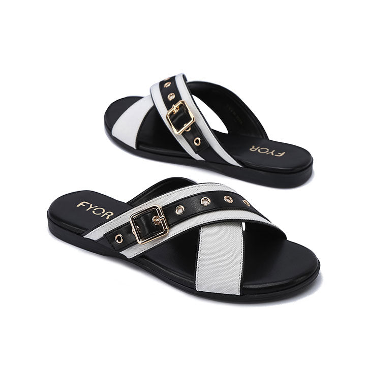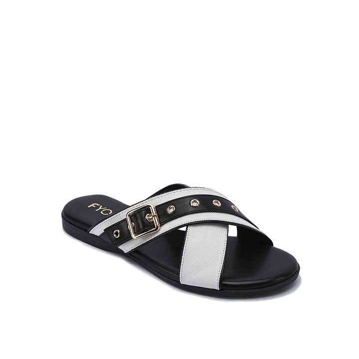 Stylish slip-on flats with a two-tone criss-cross strap design, adorned with a decorative buckle and metallic accents.