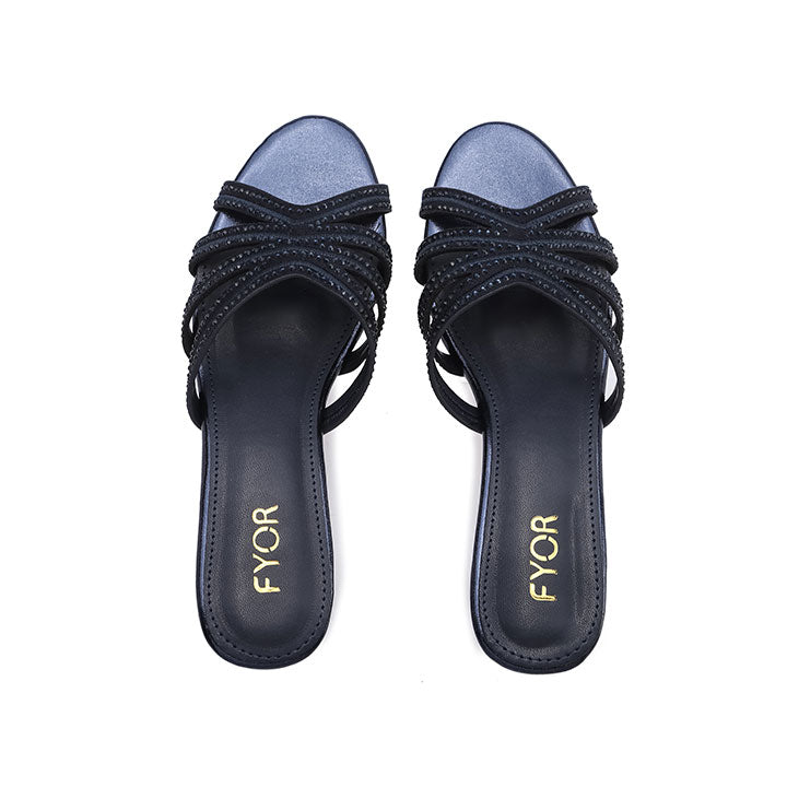 An elegant kitten heel mule with a subtle curve, featuring a crisscross strap design where the straps are fully encrusted with small, tightly-packed monochromatic rhinestones for sparkling coverage.