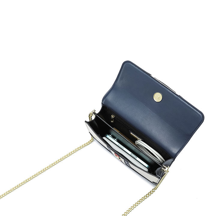 A sleek crossbody bag presenting a compact, structured silhouette adorned with a graphic color-block design and prominent vertical tricolor stripes. The elegant metallic chain strap and contrasting top handle offer versatile styling options.