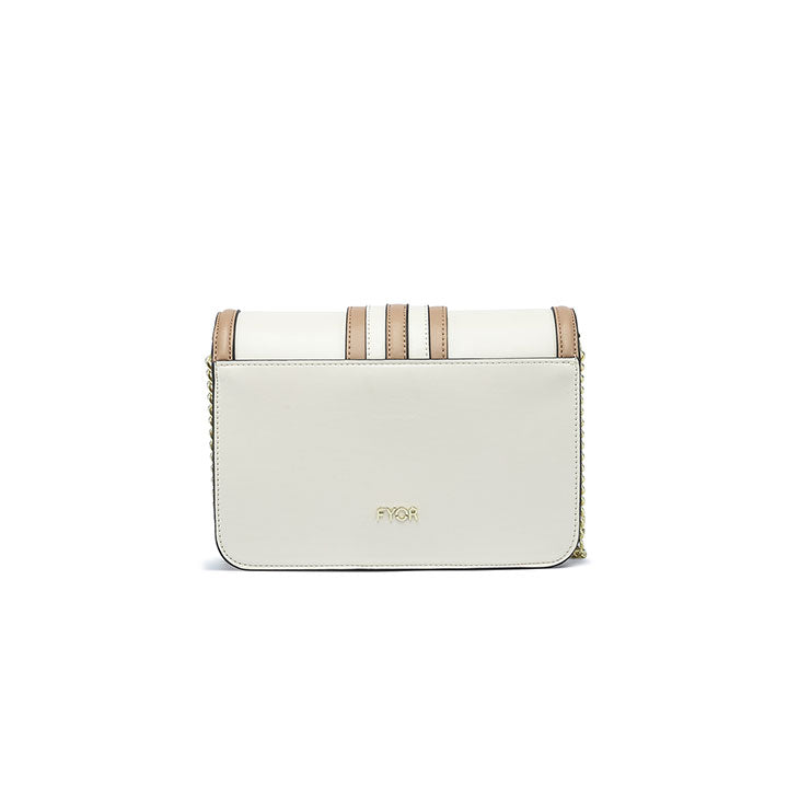 USP : Structured box silhouette, bold tricolor stripe, elegant metallic chain, dual carry options, and graphic modern design.
