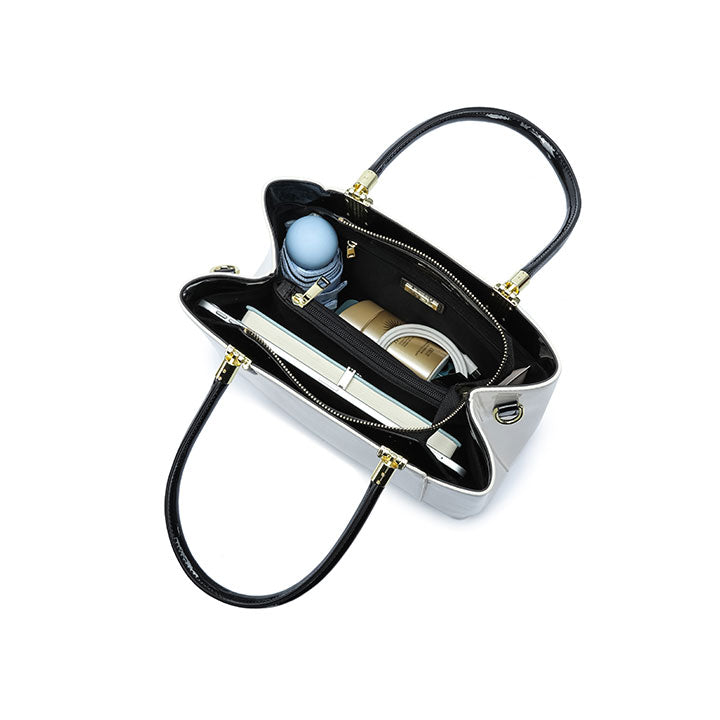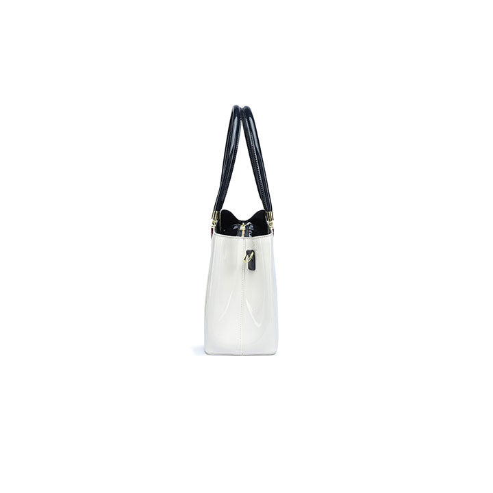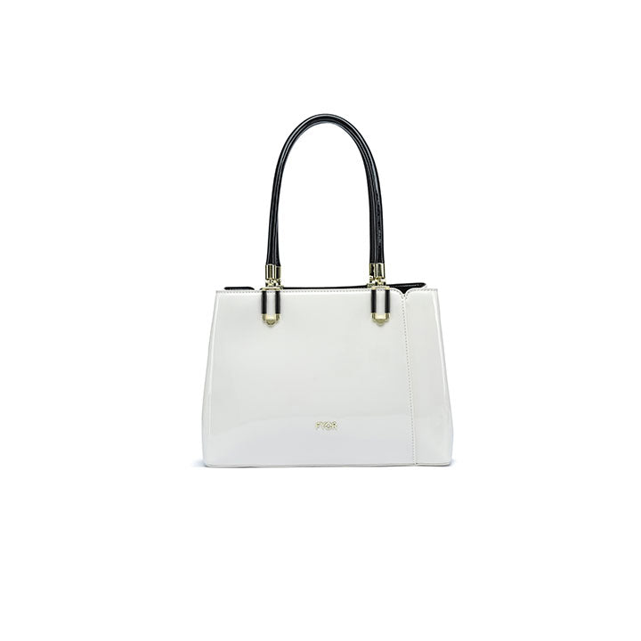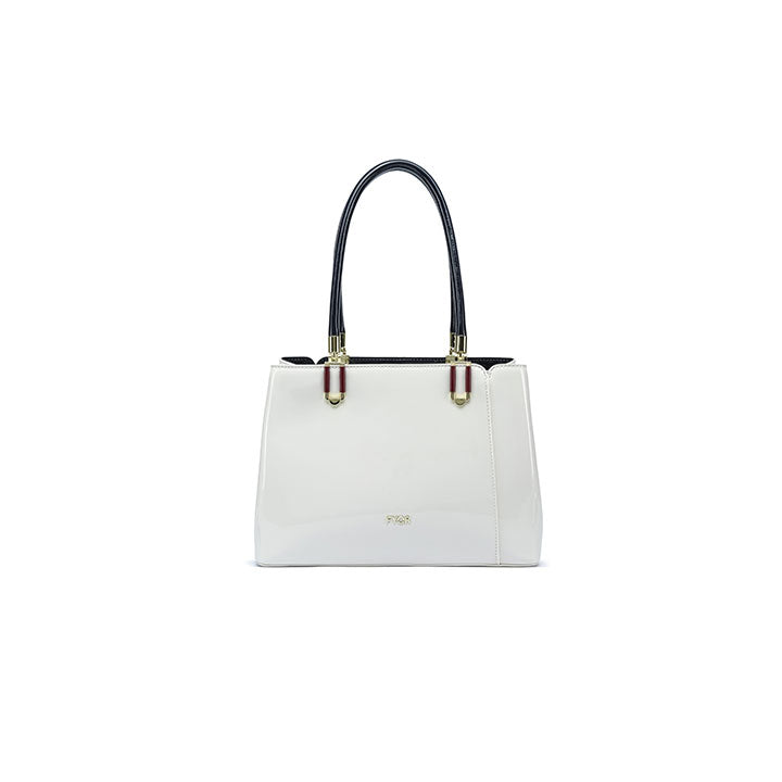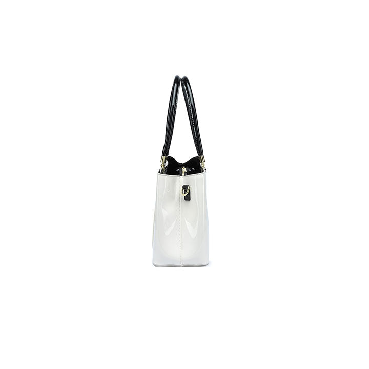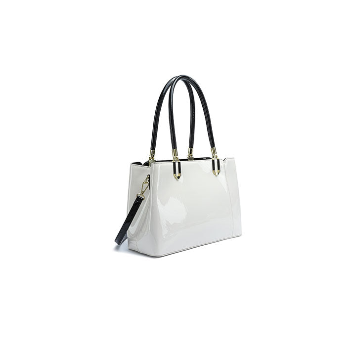 USP : Impeccably structured silhouette, luminous patent finish, bold contrast handles, refined metallic hardware, and sophisticated professional appeal.