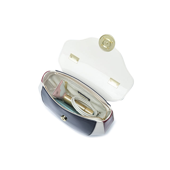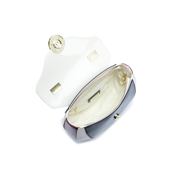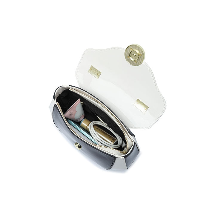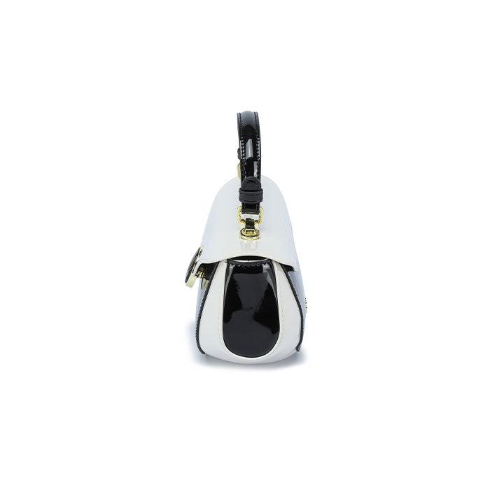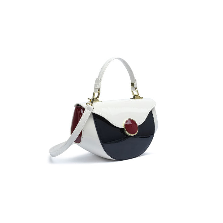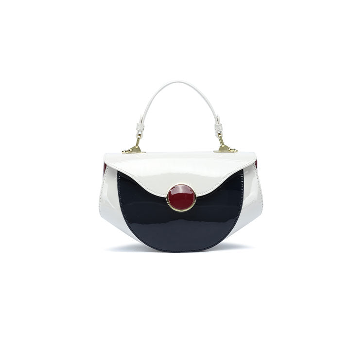 USP : Unique domed flap, structured satchel shape, bold two-tone patent, prominent circular clasp, and elegant statement piece.