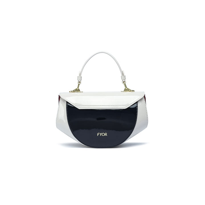 A striking handbag featuring a unique domed flap and a high-shine patent finish in a bold two-tone design. The top handle and prominent central circular hardware define its sophisticated and structured profile.